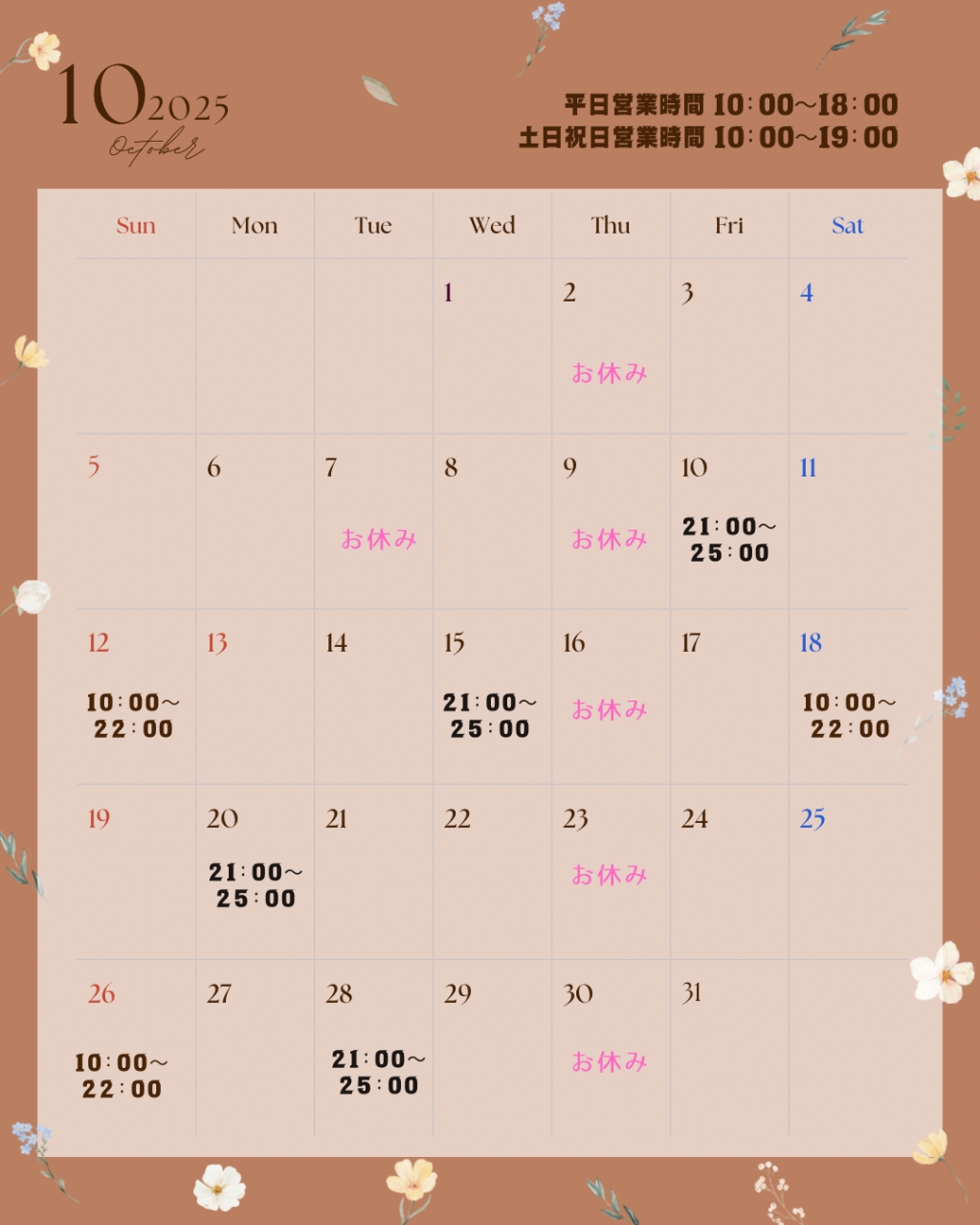 10月営業カレンダー|ヘアカットから育毛・脱毛のご相談までメンズの悩みに向き合う若林区の床屋「hair space ACCEPT」
